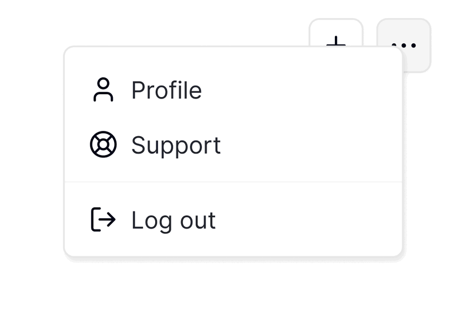 Menu dropdown Over the user dropdown can the user open a support page (open external link in new tab) Over log out can the user logoutAnd over profile get the user profile as popup opened Profile editor