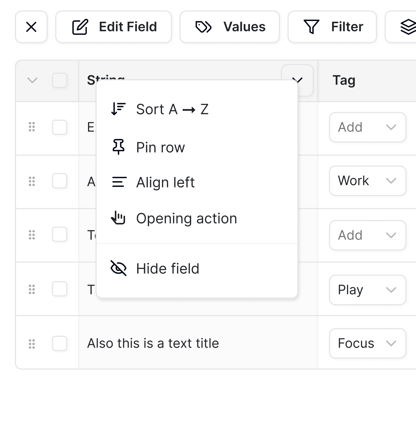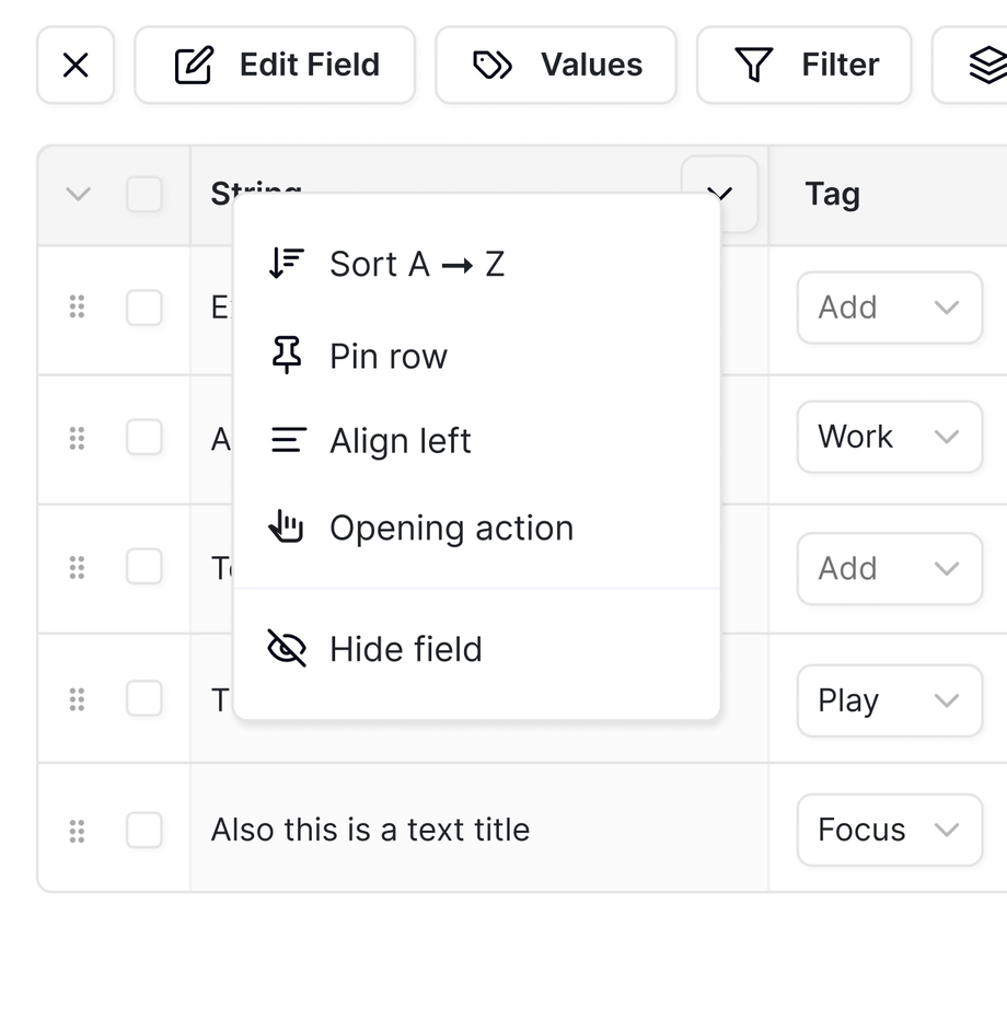 Sorting rule By clicking the title of the current row, a dropdown menu opens. The user can choose the first option to sort, and once selected, the list is sorted accordingly.